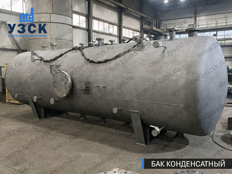 Конденсатный бак объемом 20 м³ также выполнен из стали 09Г2С. Его рабочий объем составляет 18,7 м³, полный объем — 20,4 м³. Расчетное давление — 0,05 МПа, гидроиспытательное — 0,07 МПа, рабочая температура — до 110 °С. Конструкция подготовлена к промышленной эксплуатации и транспортировке, включая необходимую комплектацию заглушками, прокладками и крепежом.